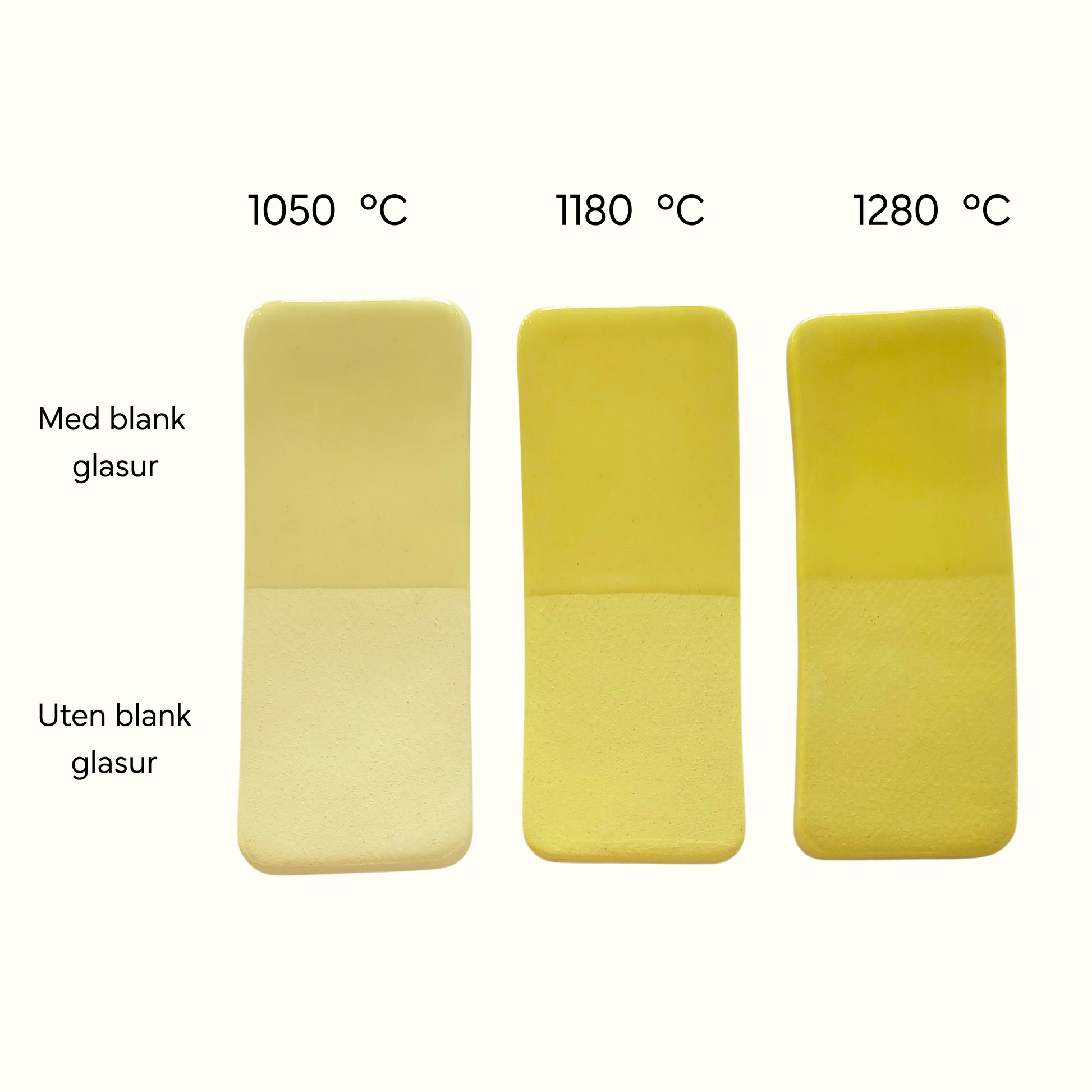 KIWI underglasur har et brenneområde fra 1050 til 1260°C (cone 04 til cone 9). Fargene er mest levende når de brennes til cone 4 eller 5 (ca. 1180°C) med blank glasur over. Hos oss i ScandiGlaze brennes alle underglasurene til 1240°C.
